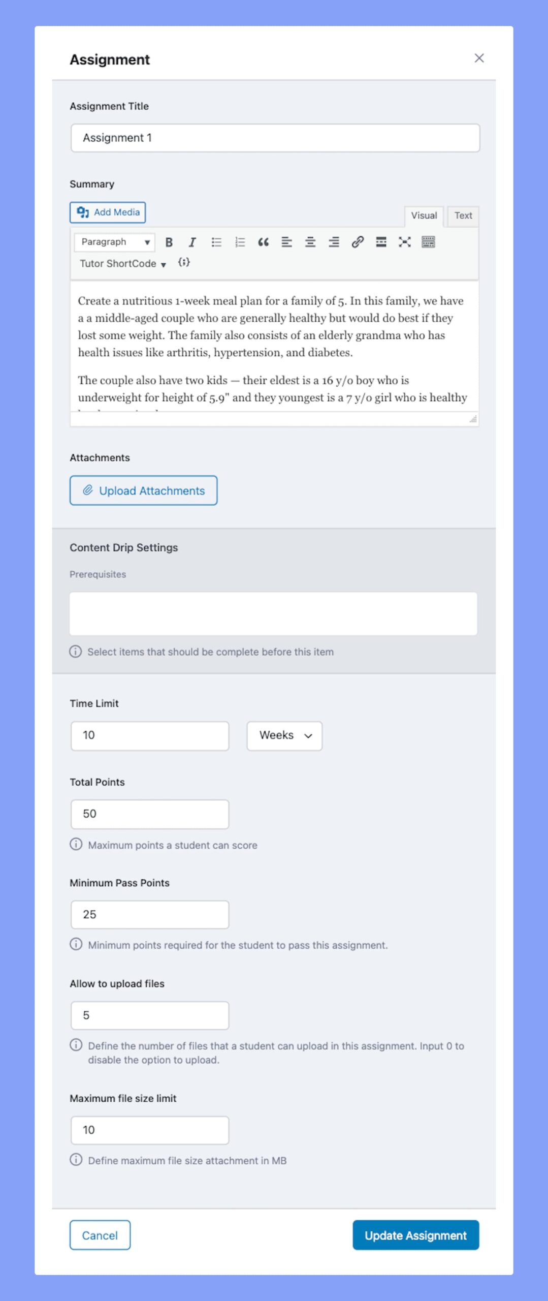 Finally, add this new Assignment to your course by clicking on the Update Assignment button.