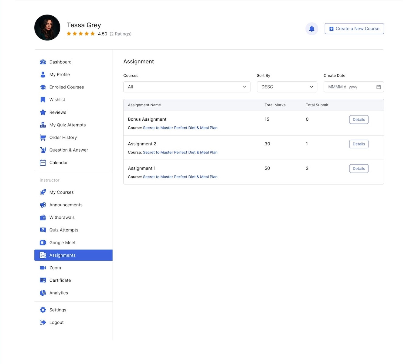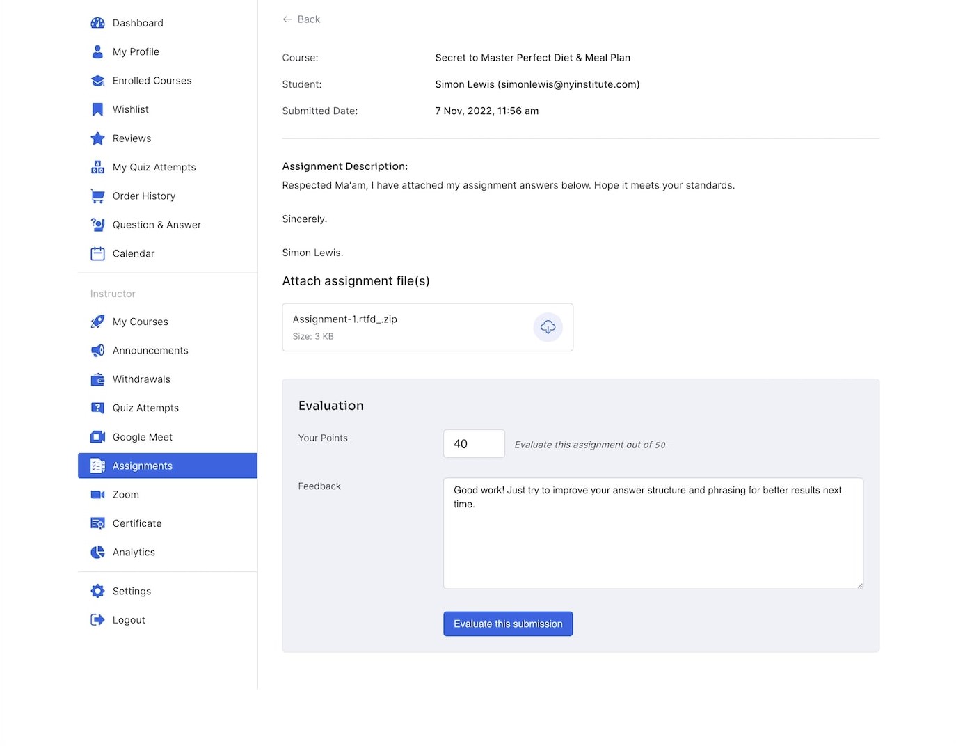 Once you’ve entered the Assignments Evaluation Panel, you’ll first be greeted with basic details about the Assignment like Course Name, Student Name, and Submitted Date.