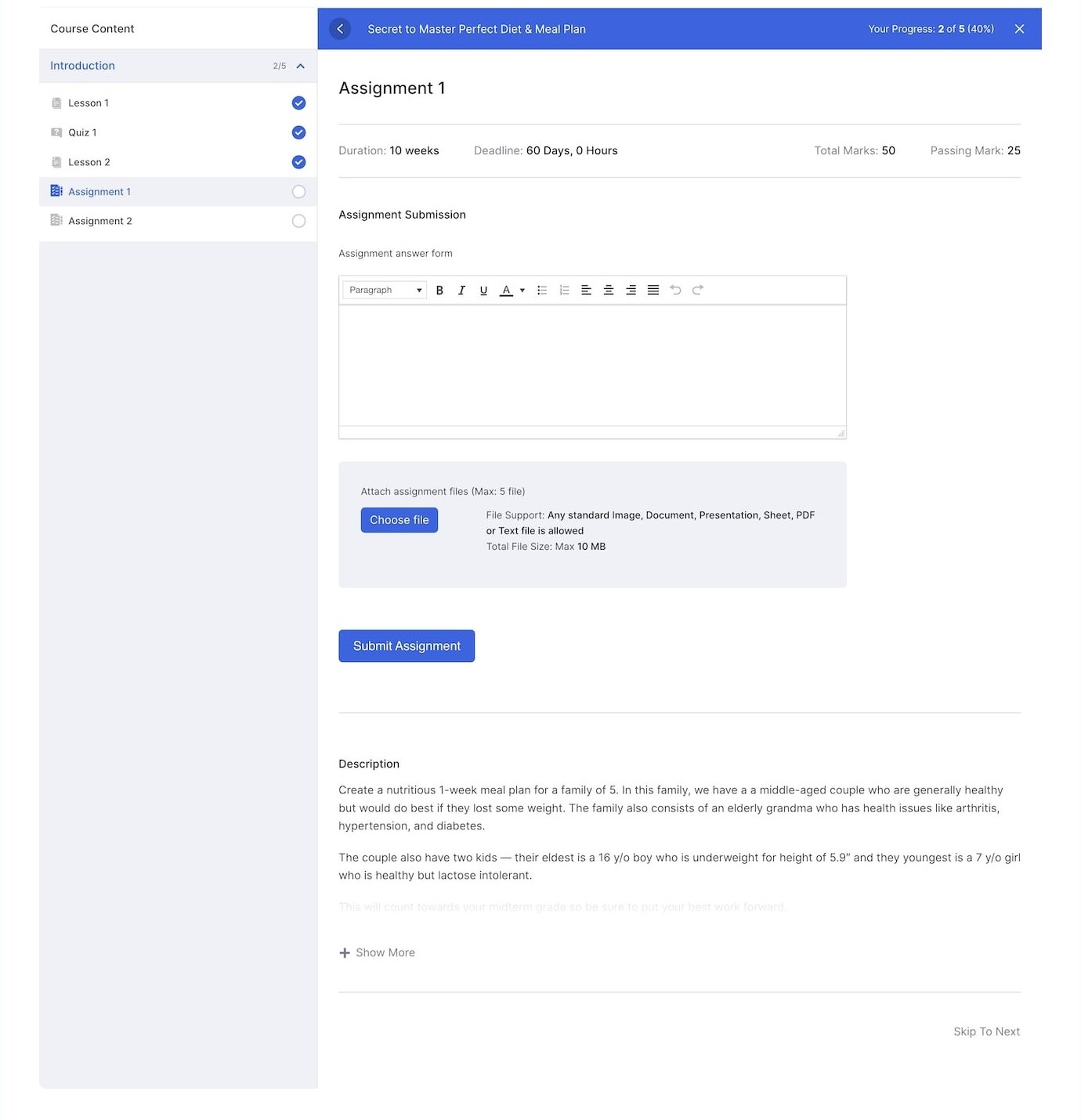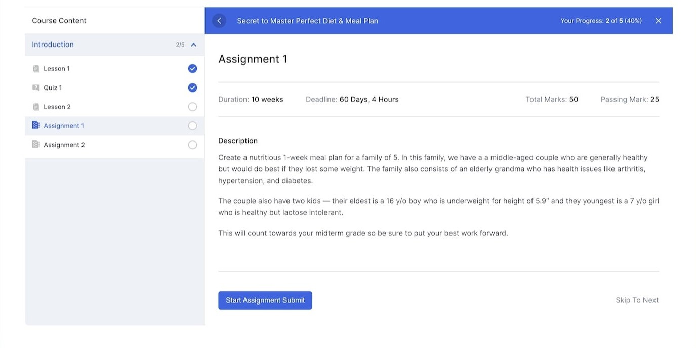 Students will find the Assignment on the Course Journey Page i.e. Lesson View. Here, you’ll be able to see the Assignment Name, Duration, Deadline, Total Marks, Passing Marks, and Description. To submit an answer, all you have to do is click on the Start Assignment Submit button.