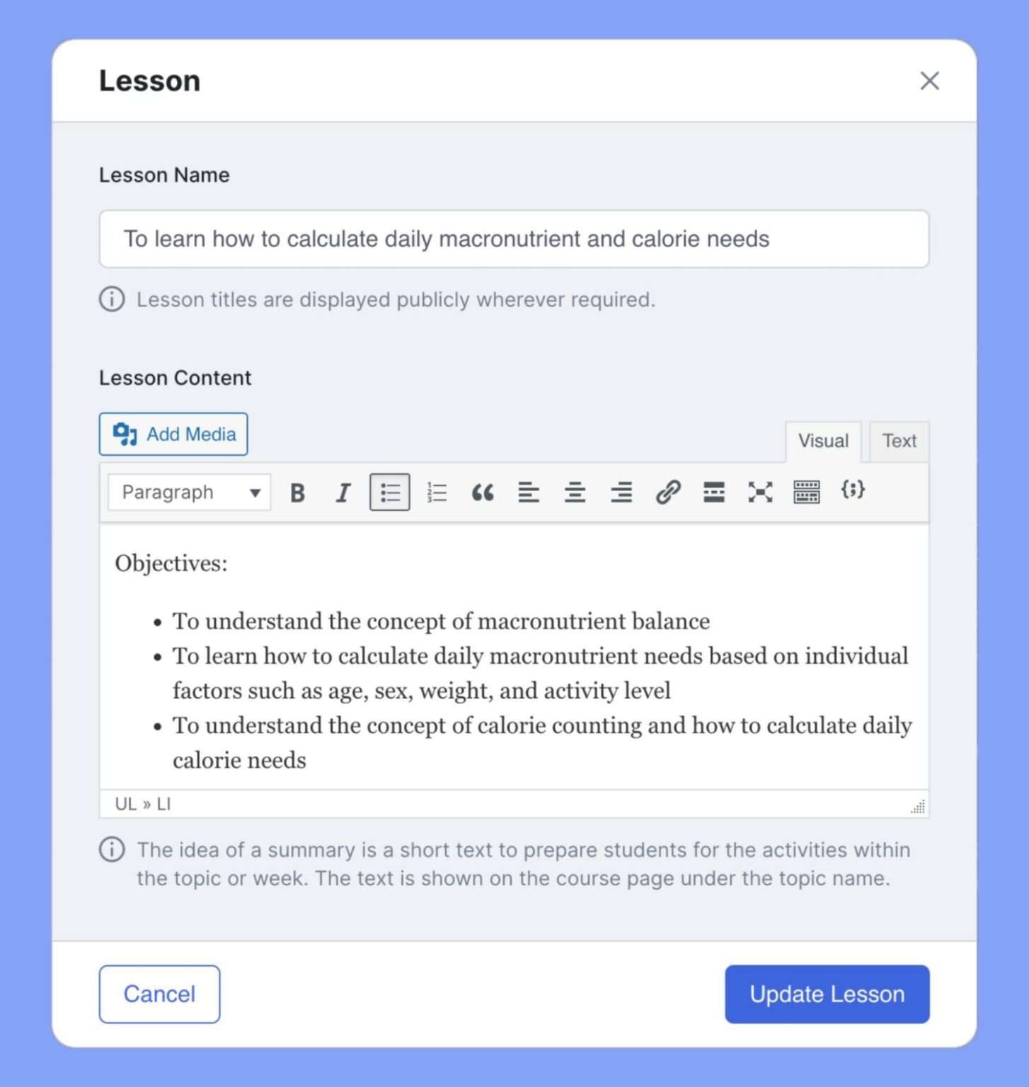 Use this field to give potential students a general idea of what they can expect from this course, such as what the course will entail, its learning objectives, a brief overview of the syllabi, and so on.
