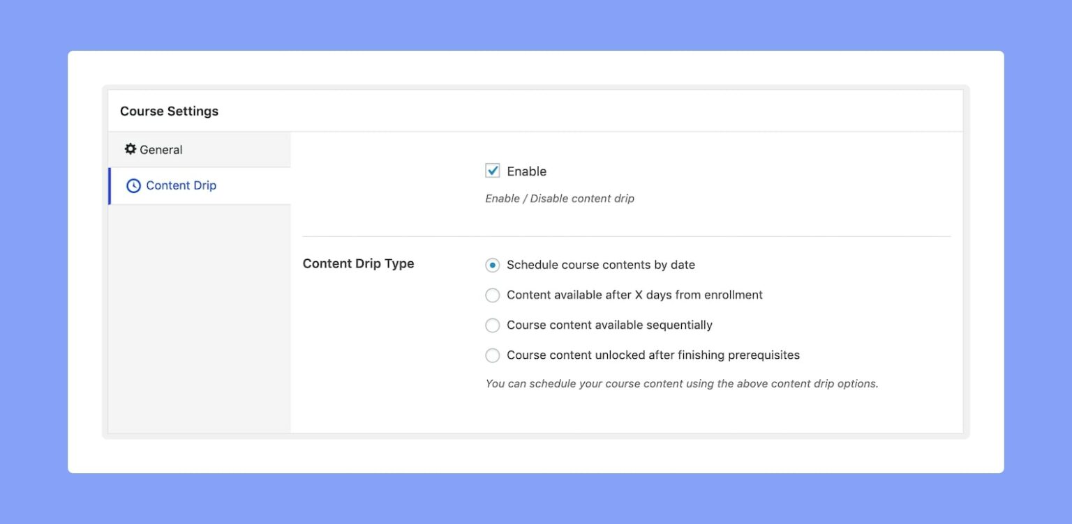 The Content Drip allows you to release lessons, quizzes, and assignments based on their selected criteria. To use the content drip feature, you will see a new tab for course settings on the course edit page.