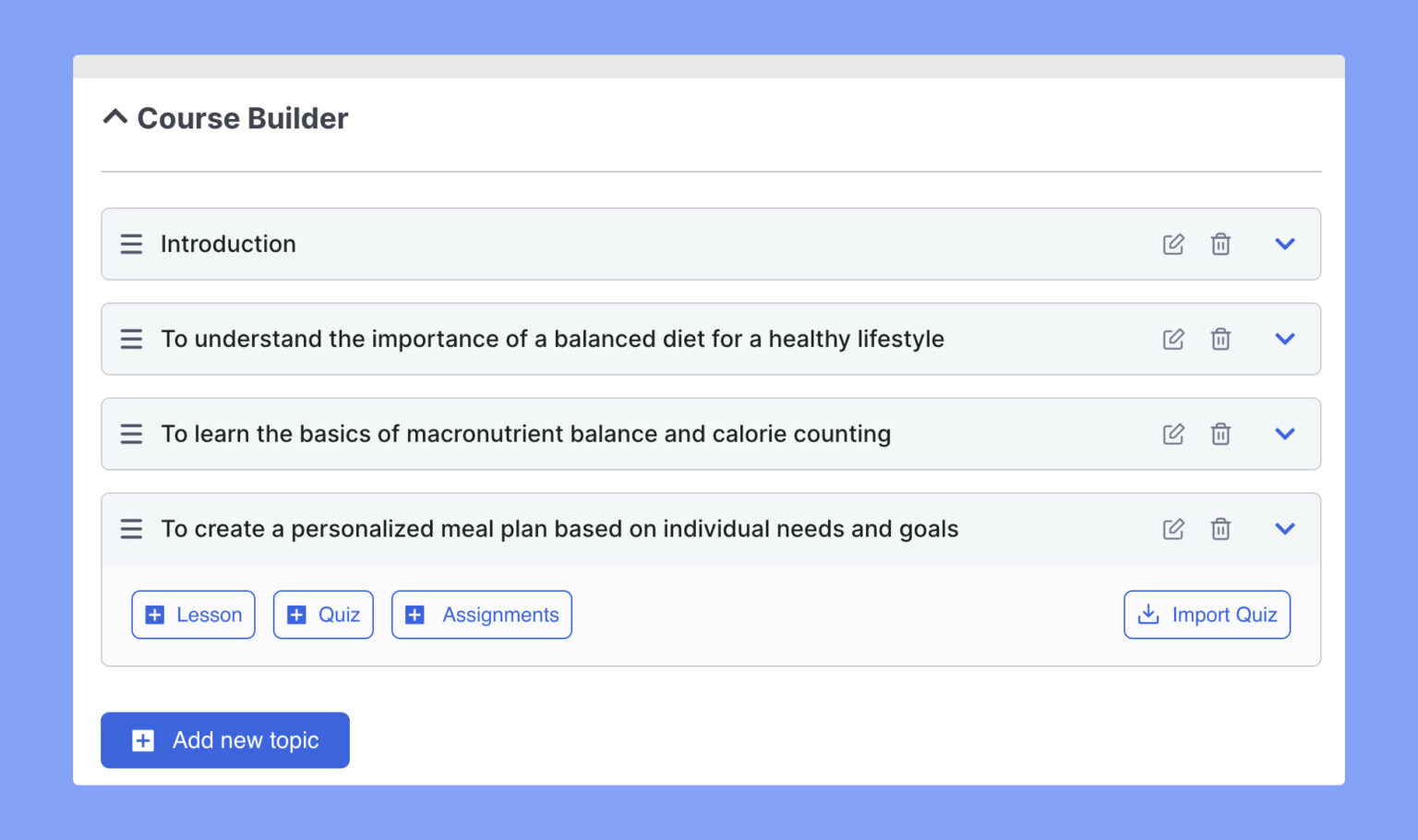 The “Add New Topic” function allows you to easily create and organize your course content. Simply provide a name and brief summary for each topic, and use the buttons provided to add lessons and quizzes. The process is intuitive and guided by helpful tooltips, ensuring a smooth and streamlined experience.