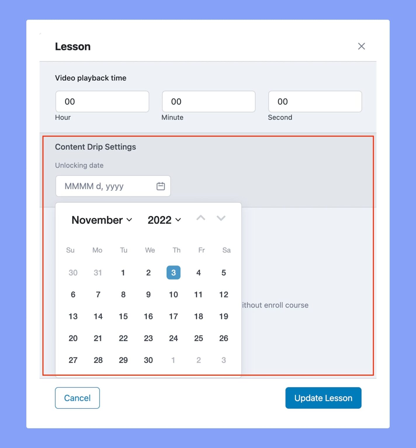 Enabling this option will add a number field to all content forms where you can set how many days it will take to unlock it. The starting date is the student’s enrollment date and will be counted from then onwards.