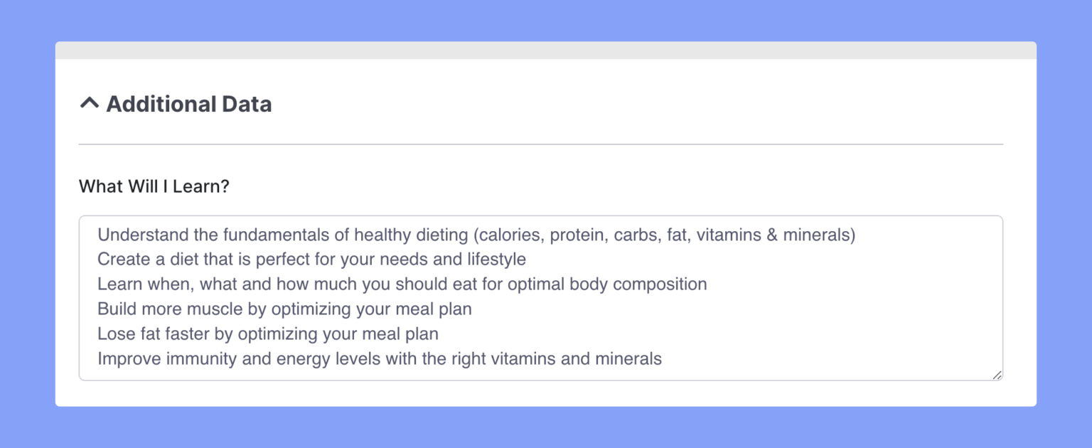 The following data acts as informative data for potential students while also acting as marketing material for your course.