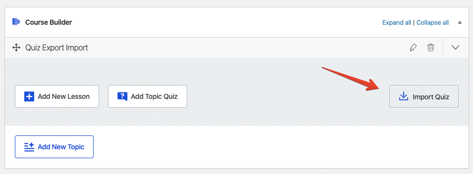 After you have created a course topic and added a quiz as a topic, you will find an Import Quiz button on the right side of the quiz section. Click on it to open the file explorer in your local environment, and choose your desired CSV file.
