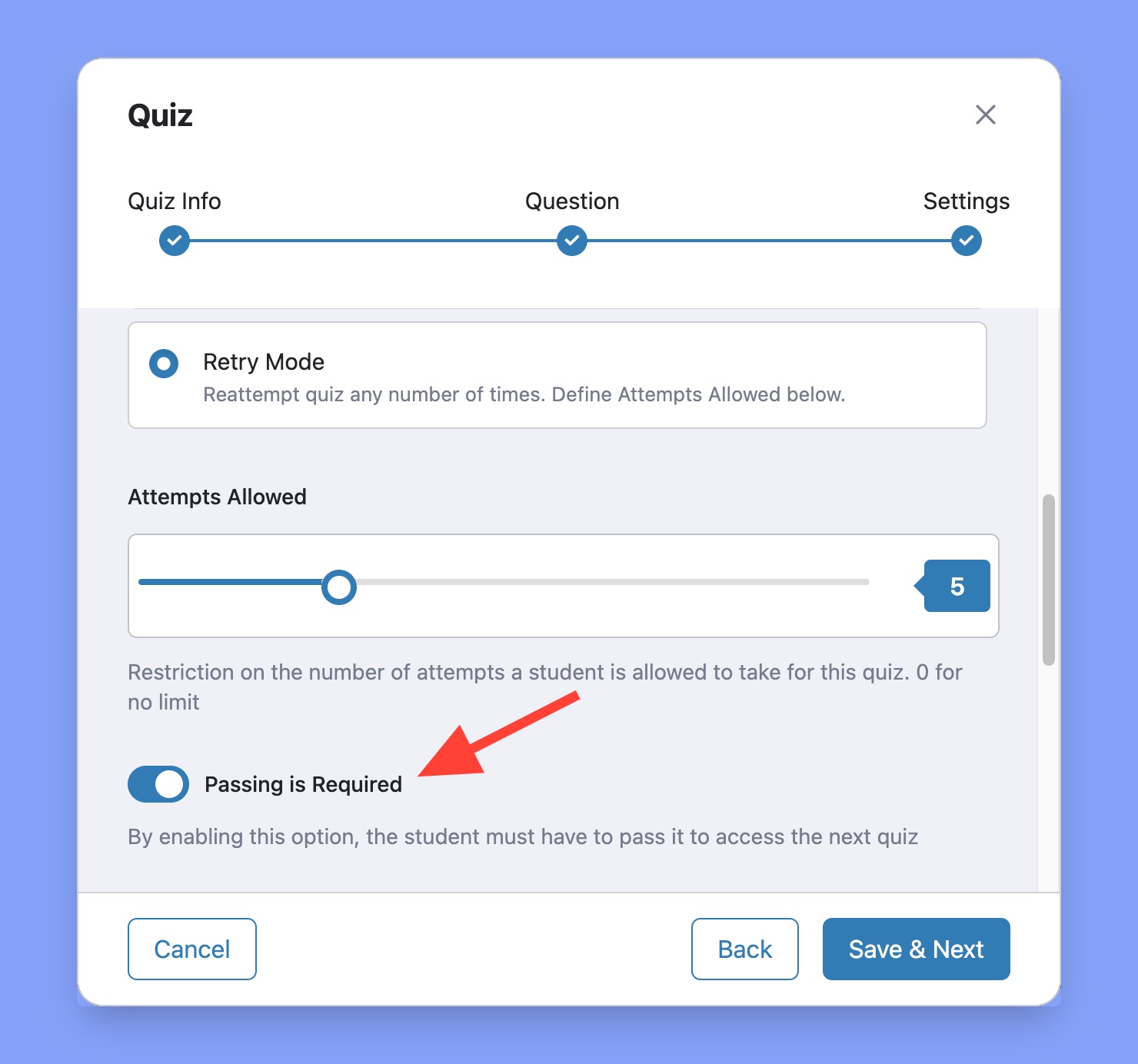 4. Finally, you should see the Passing is Required toggle appear below the Attempts Allowed slider. All you have to do now is enable this option, click on Save & Next, and Update your course to save the changes.