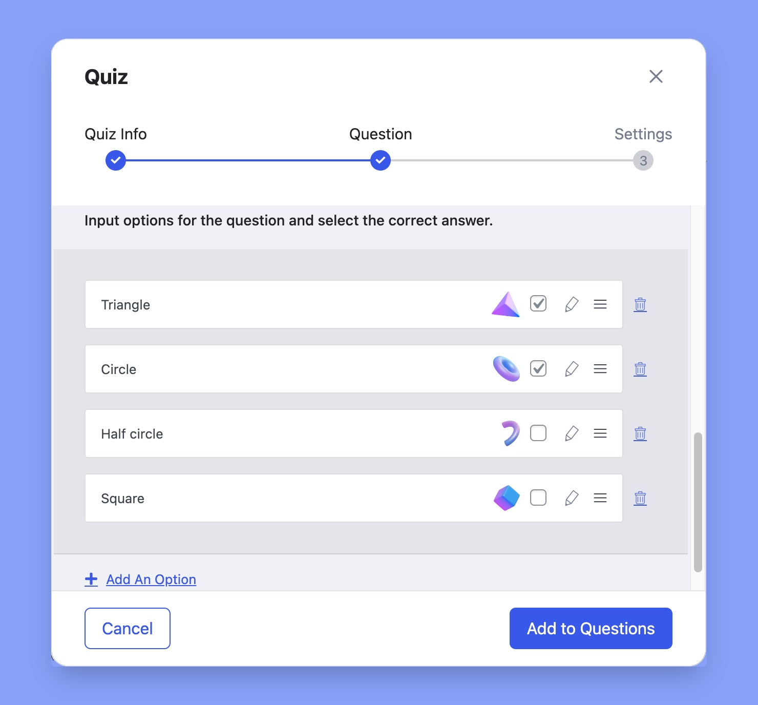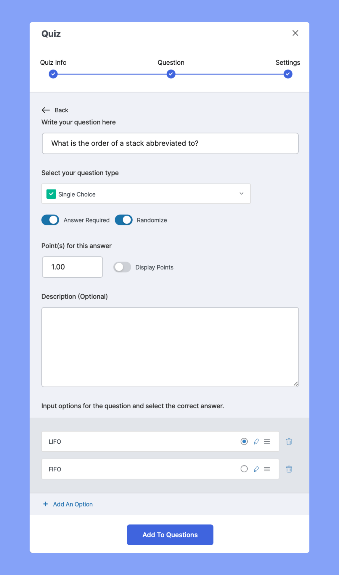 Add the relevant answer(s) and select the correct answer if required. Once you’re done, click on Add to Questions to save it. Doing this will take you back to the previous window where you’ll see the new question already added.
