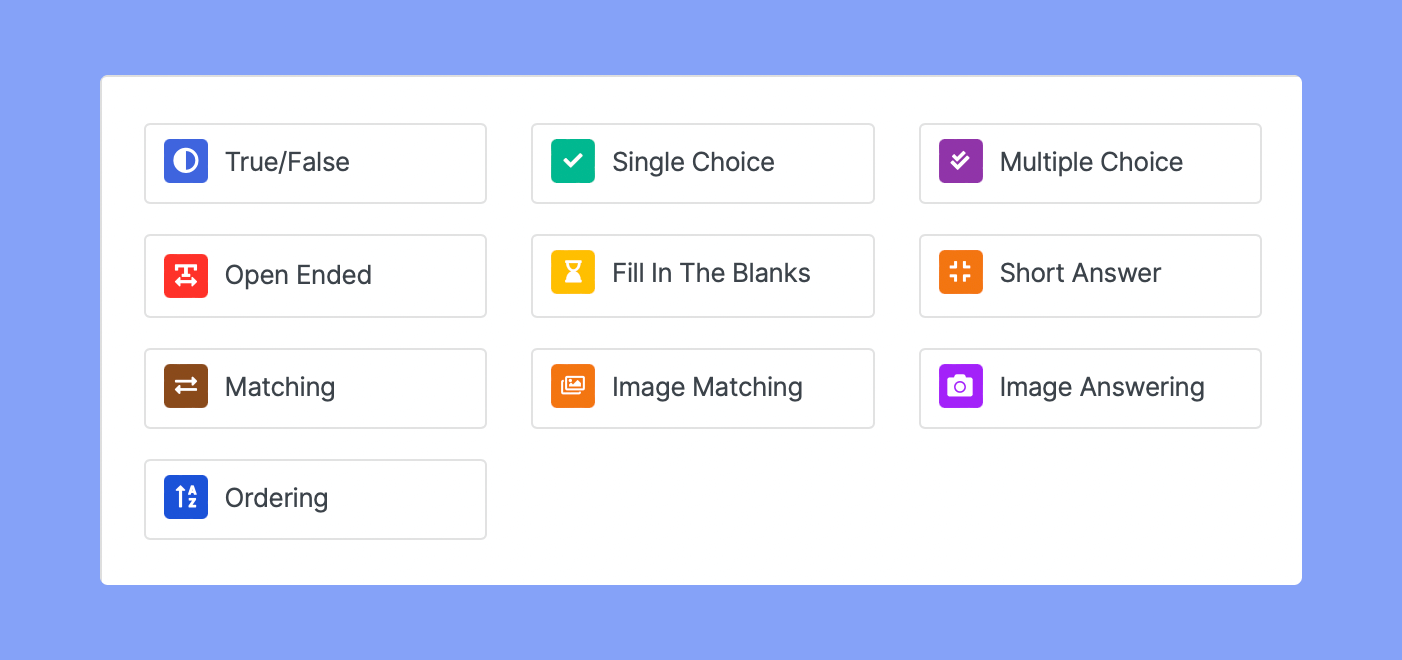 At the Question stage, you can start adding questions to the quiz by clicking on the Add Question button. This will take you to the Question form where you must first select the Question Type. In the Quiz section, you will find the following types of quizzes that you can create for your lesson.