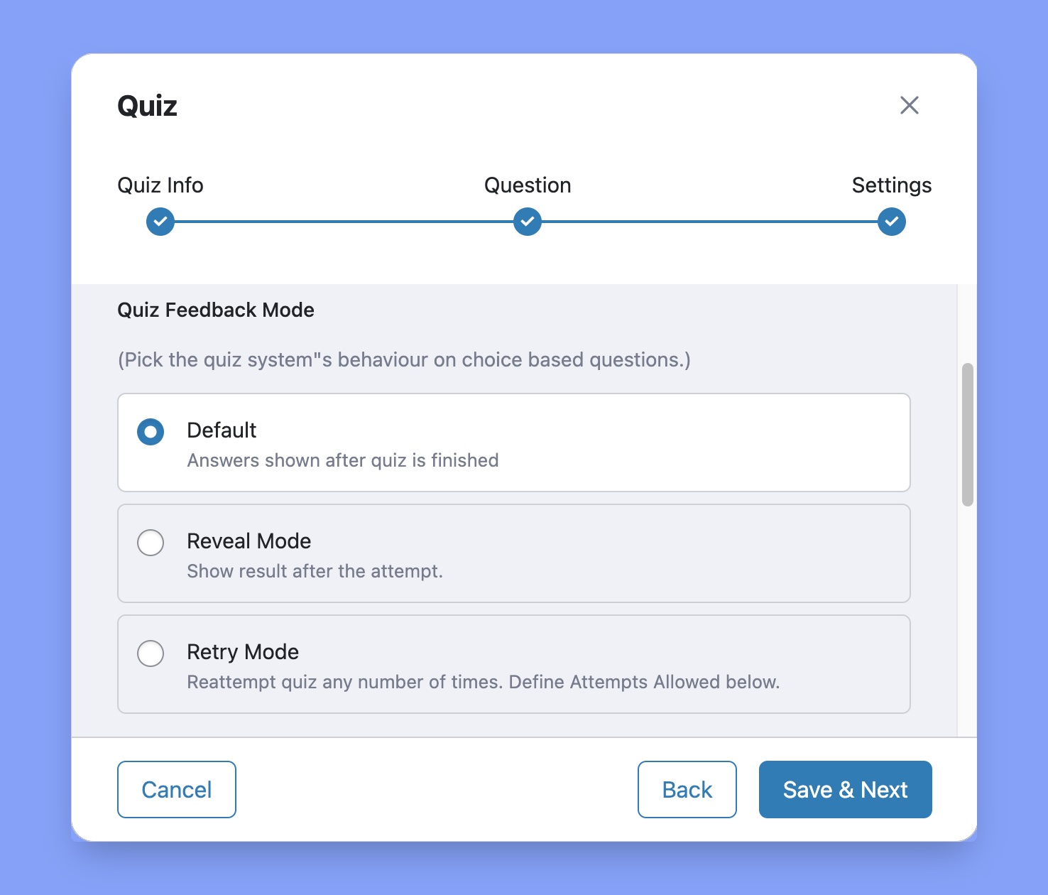 3. Next, from Quiz Builder > Settings set the Quiz Feedback Mode as Retry Mode.