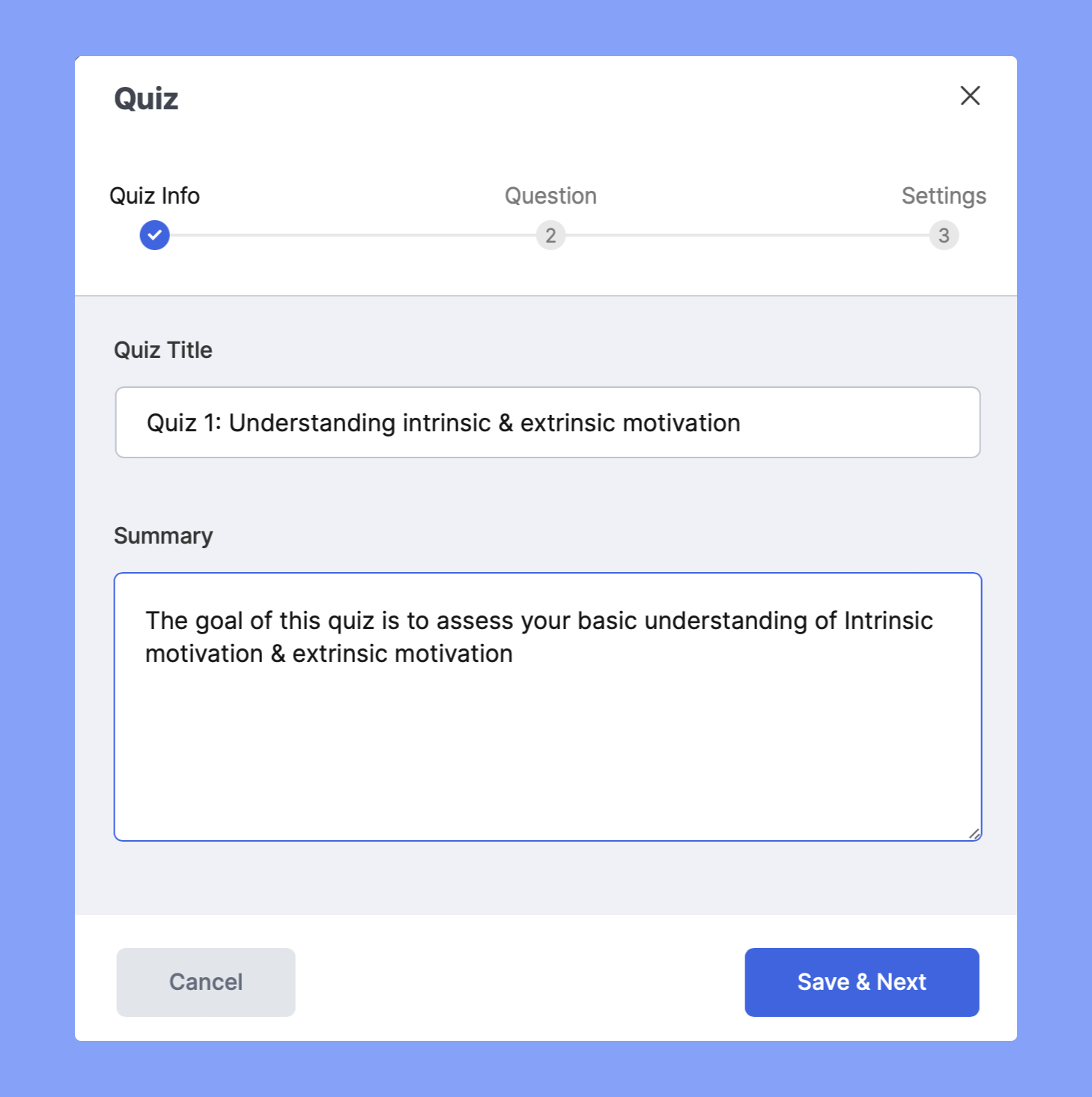 This will open the Quiz Builder window with its very first section called Quiz Info. Here, give the quiz a Title and add a short summary to let students know what this quiz is about.