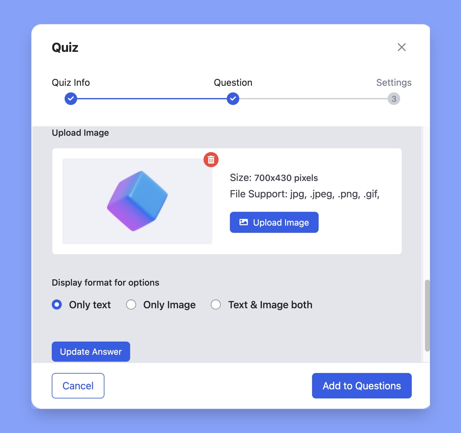 You can also upload an image along with the answer prompt. Finally, select the display format you prefer and repeat these steps to add more options.