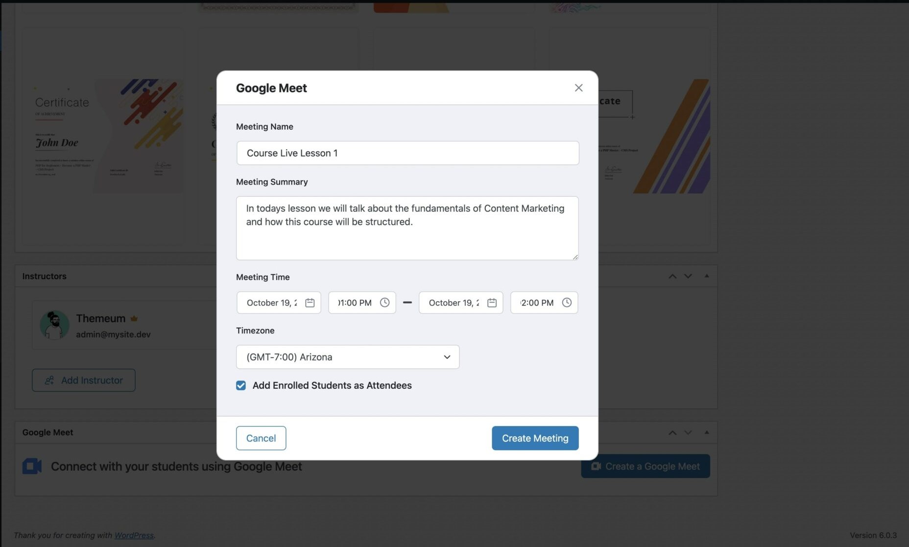 Clicking on Create a Google Meet will bring up a pop up where you can configure the details of your meeting.