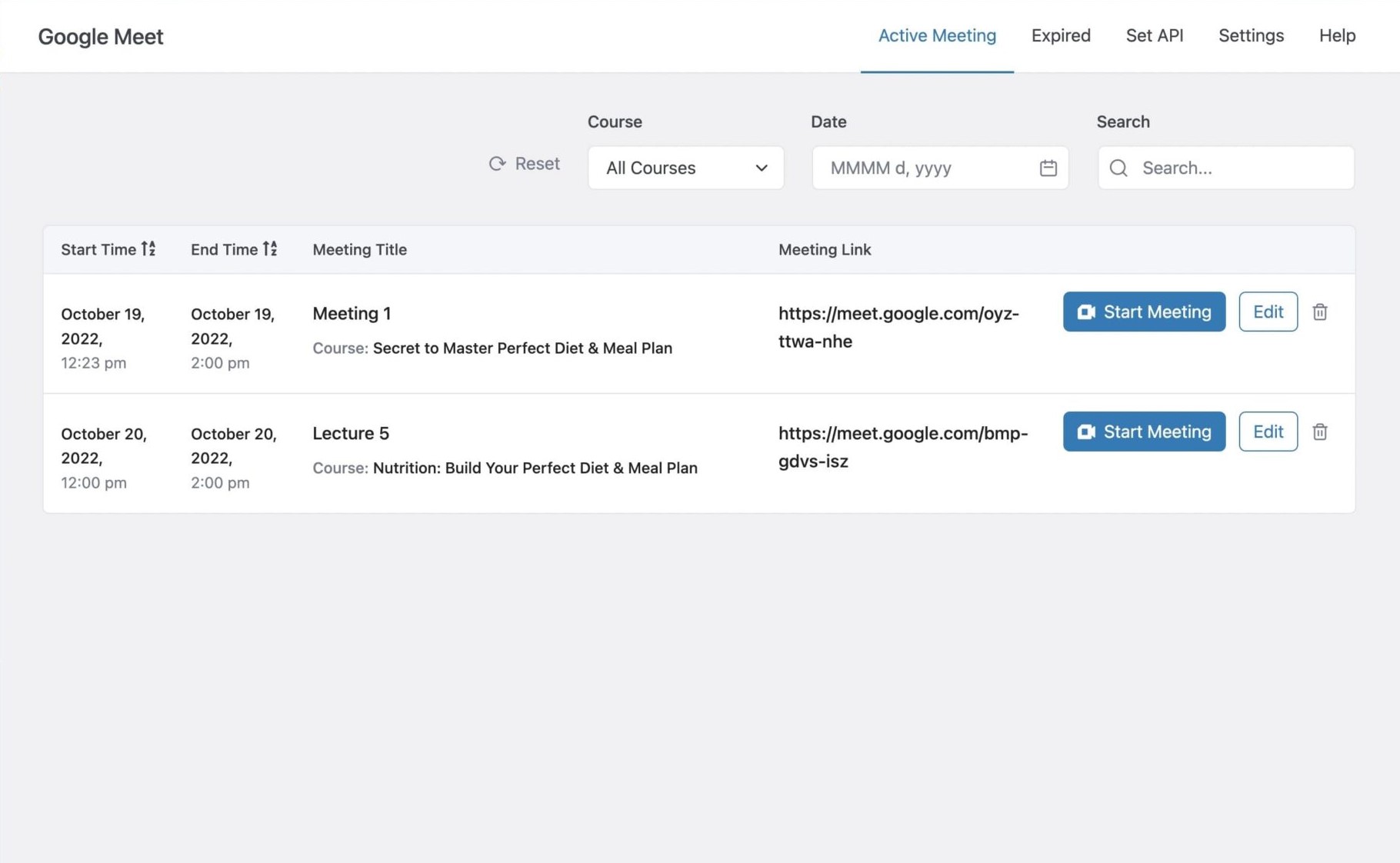Google Meet integration lets you conduct Google Meet meetings with students. You can set up and start meetings for your courses. You also have the feature to send Google Meeting invitations to enrolled students.
