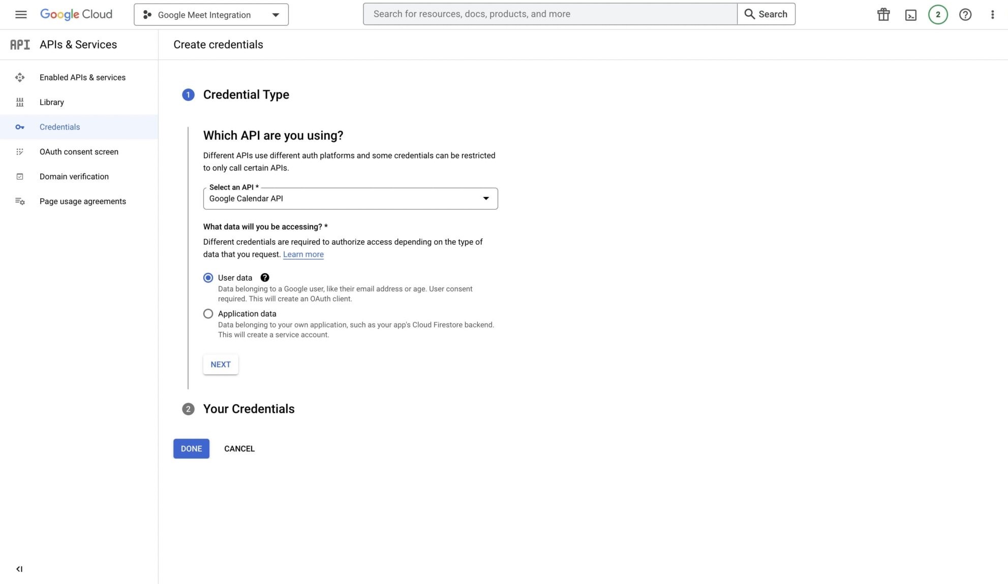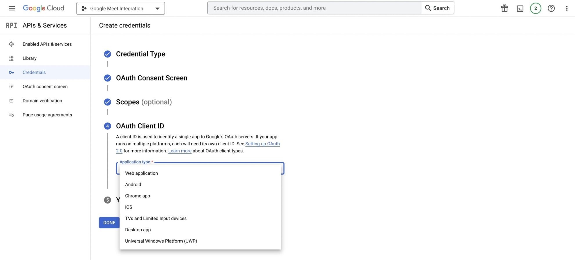 To connect with Google Meet, you need to first create Google Credentials. You can do that by visiting Google Developer Console.