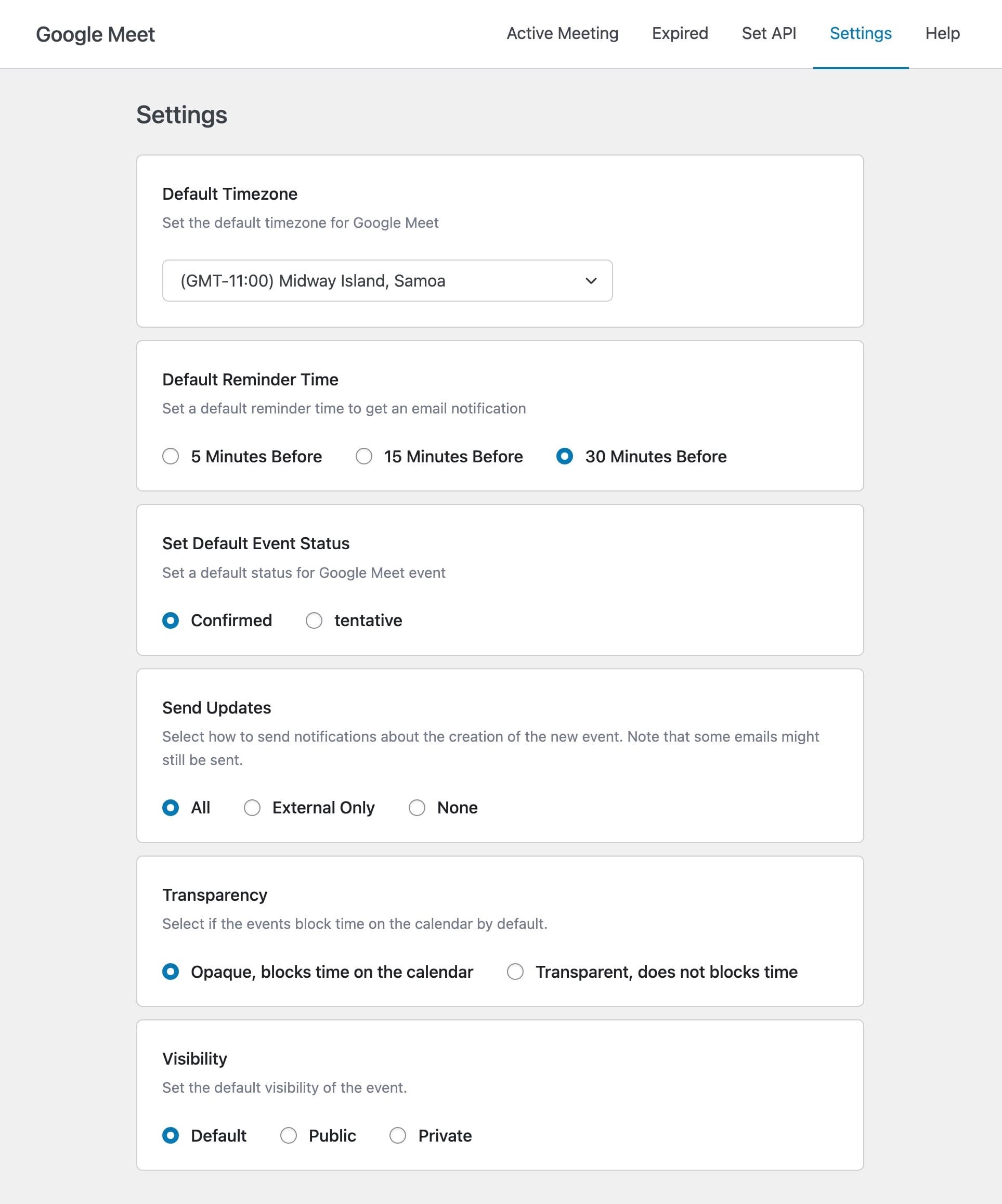 Set Default Event Status: Set a default status for Google Meet event.
